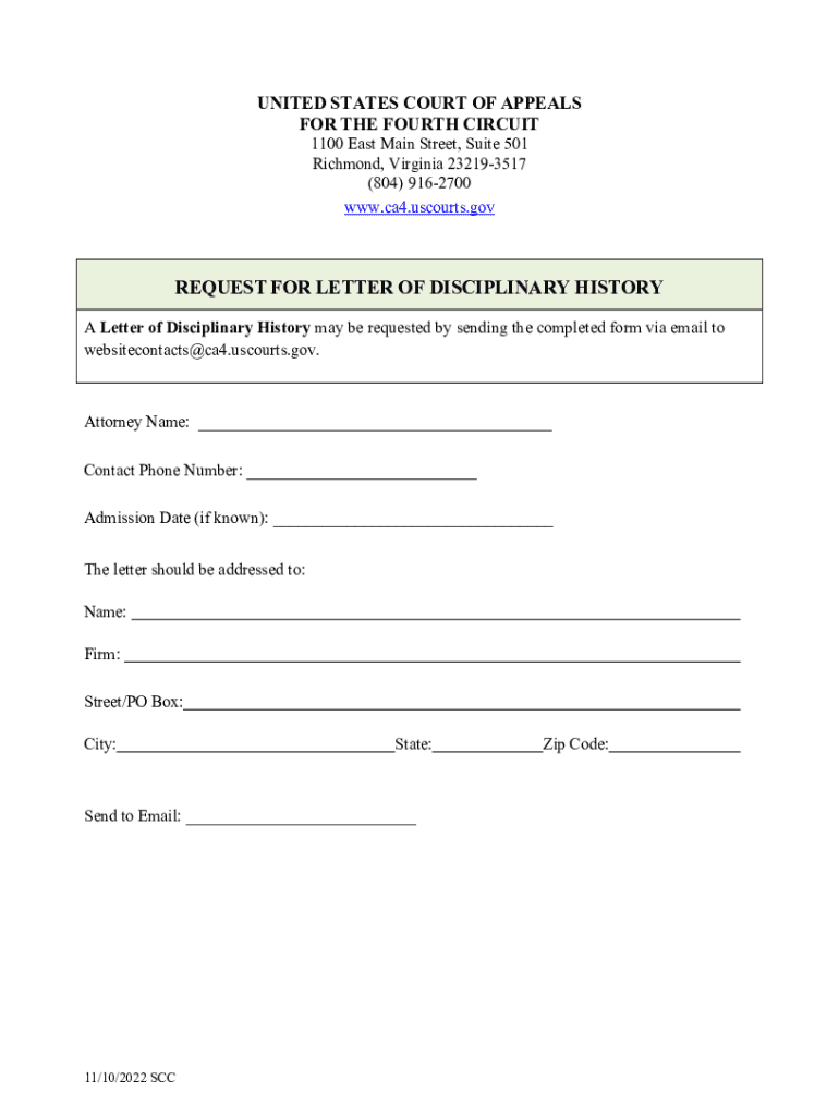 UNITED STATES COURT OF APPEALS FOR THE FOURTH CIRCUIT 1100 East Main Street, Suite 501 Richmond, Virginia 232193517 (804) 9162700 www.ca4.uscourts.govREQUEST FOR LETTER OF DISCIPLINARY HISTORY A Letter
