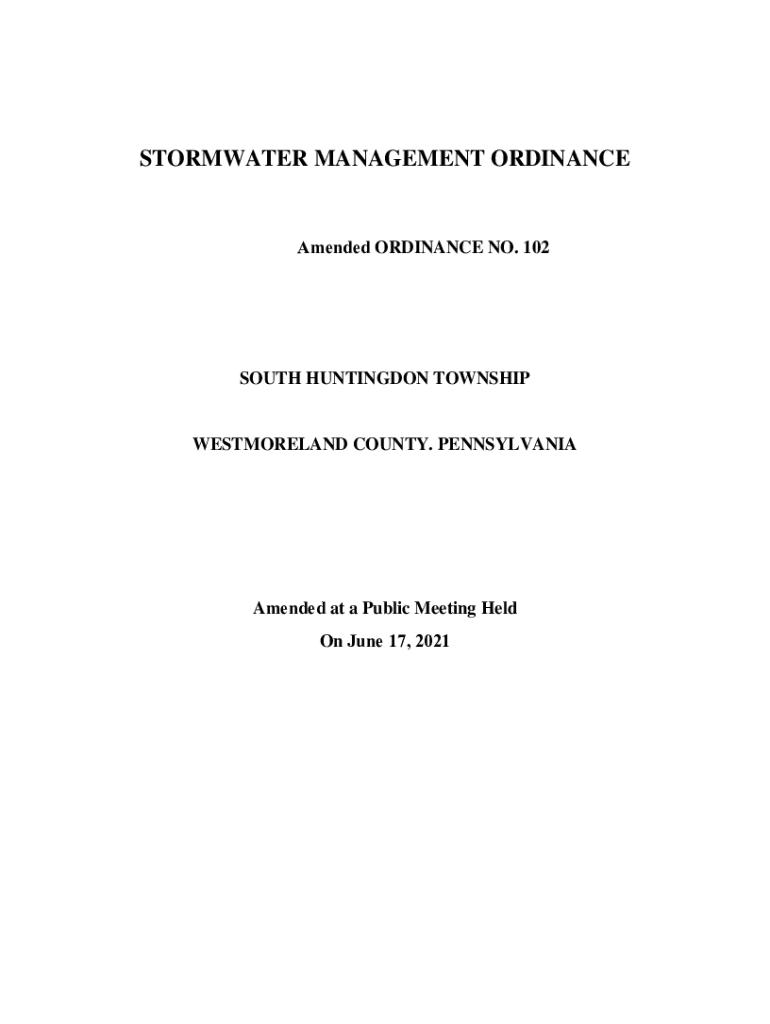 STORMWATER MANAGEMENT ORDINANCEAmended ORDINANCE NO. 102SOUTH HUNTINGTON TOWNSHIPWESTMORELAND COUNTY. PENNSYLVANIAAmended at a Public Meeting Held