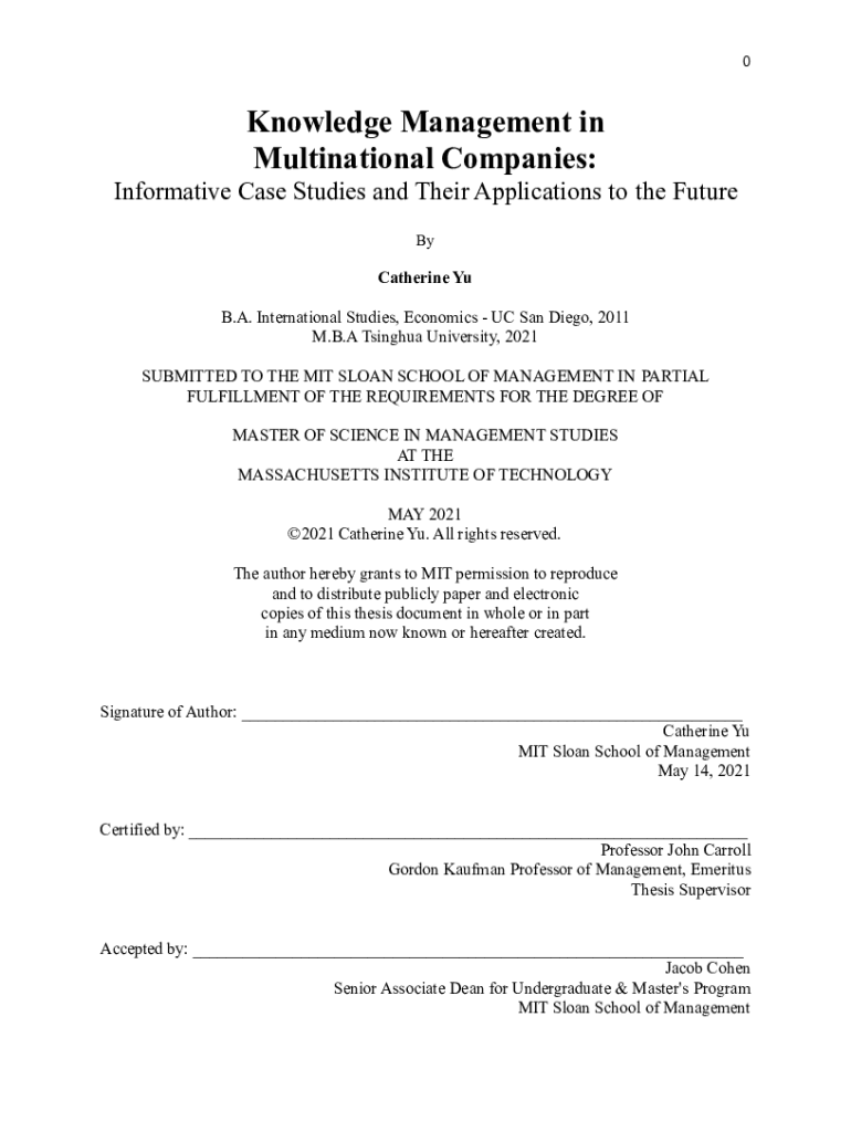 0Knowledge Management in Multinational Companies: Informative Case Studies and Their Applications to the Future ByCatherine Yu B.A. International Studies, Economics UC San Diego, 2011 M.B.A Tsinghua
