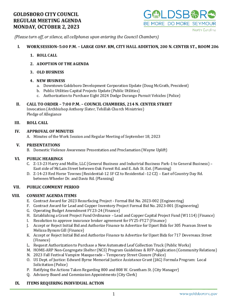 GOLDSBORO CITY COUNCIL REGULAR MEETING AGENDA MONDAY, OCTOBER 2, 2023 (Please turn off, or silence, all cellphones upon entering the Council Chambers) I.WORK SESSION5:00 P.M. LARGE CONF. RM, CITY