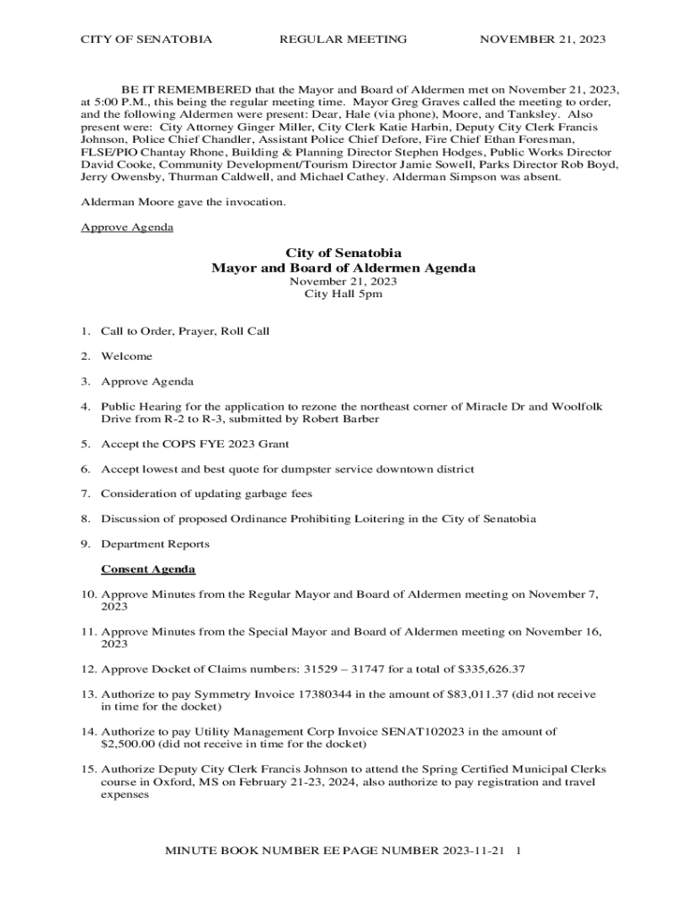 CITY OF SENATOBIAREGULAR MEETINGNOVEMBER 21, 2023BE IT REMEMBERED that the Mayor and Board of Aldermen met on November 21, 2023,