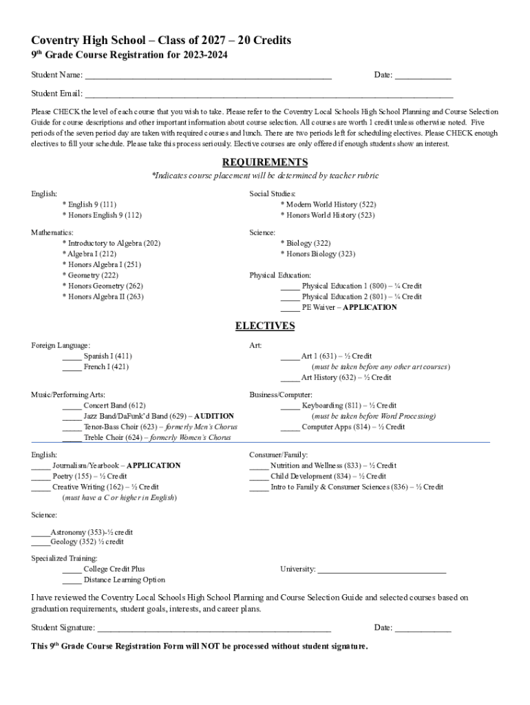 Coventry High School Class of 2027 20 Credits 9th Grade Course Registration for 20232024 Student Name: ___Date: ___Student Email: ___ Please CHECK the level of each course that you wish to take. Please