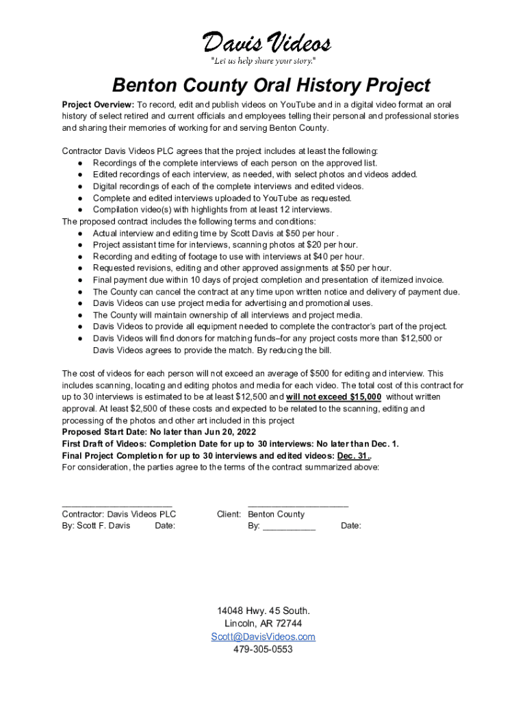 Benton County Oral History Project Overview: To record, edit and publish videos on YouTube and in a digital video format an oral history of select retired and current officials and employees telling