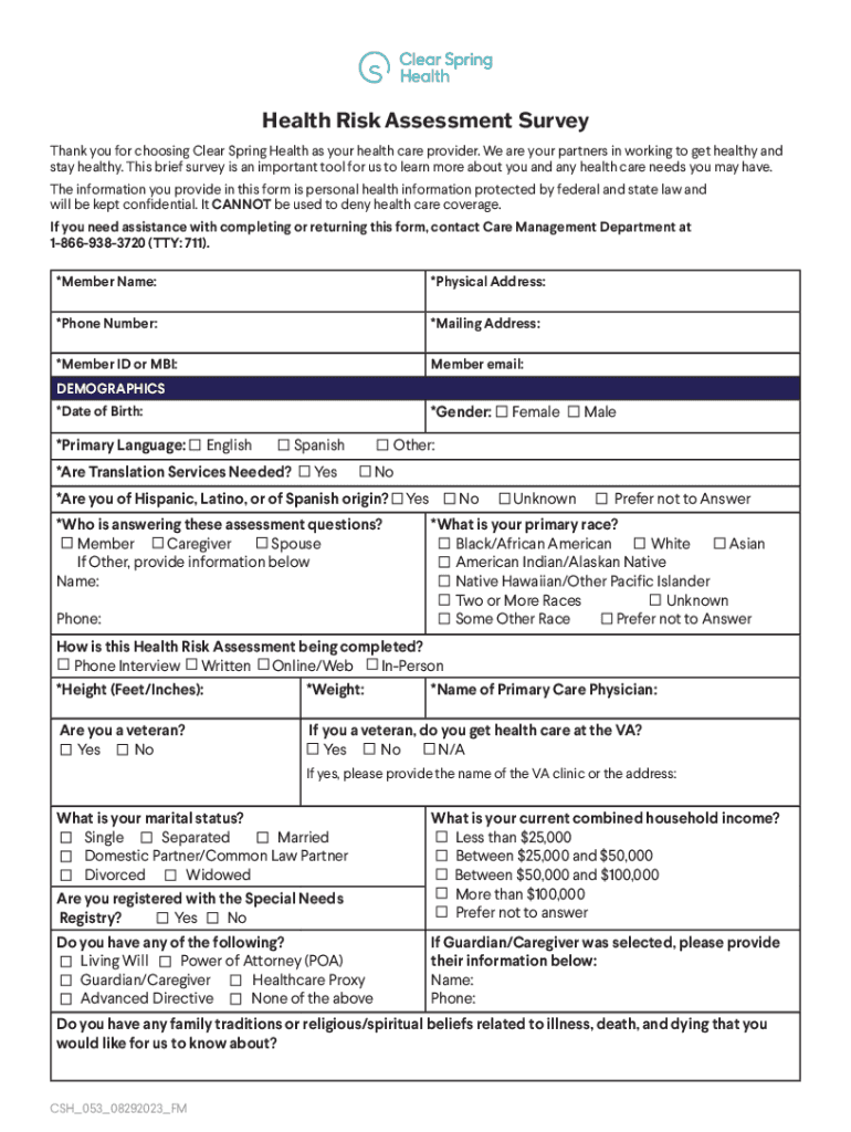 Health Risk Assessment Survey Thank you for choosing Clear Spring Health as your health care provider. We are your partners in working to get healthy and stay healthy. This brief survey is an important