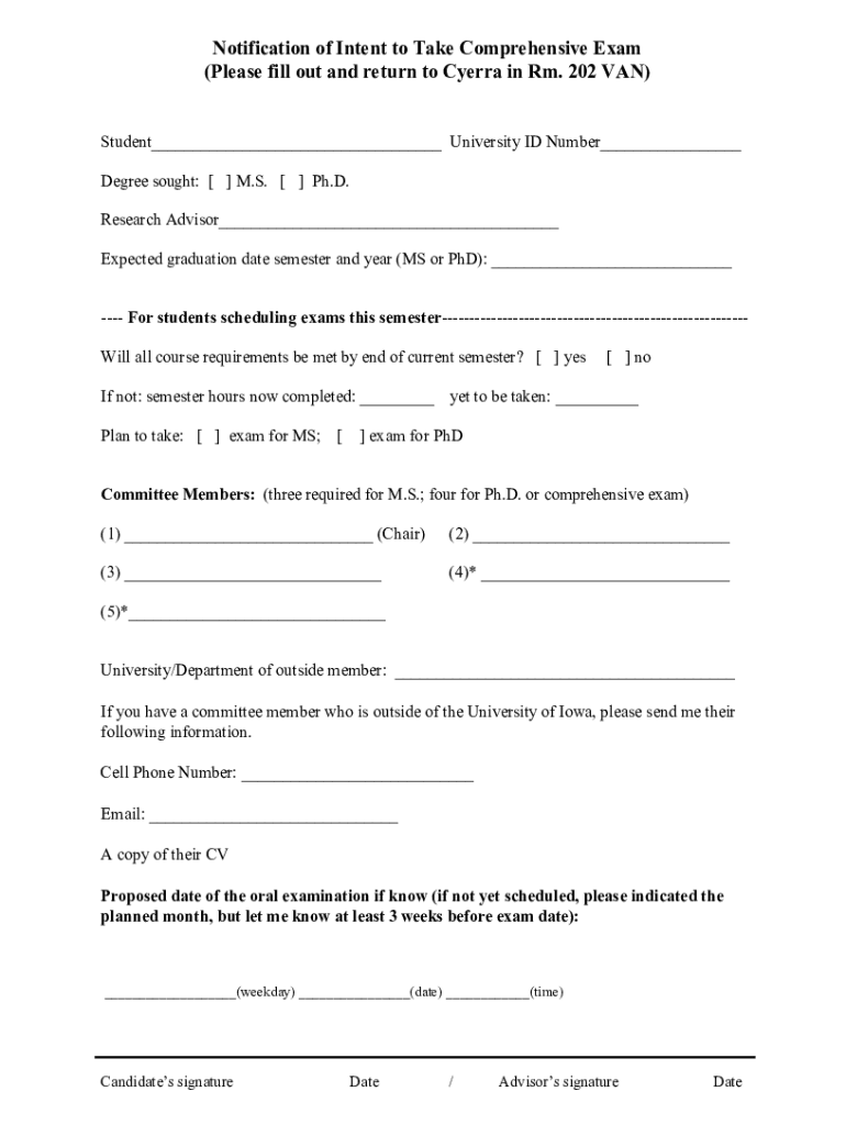 Notification of Intent to Take Comprehensive Exam (Please fill out and return to Cherry in Rm. 202 VAN) Student___ University ID Number___ Degree sought: [ ] M.S. [ ] Ph.D. Research Advisor___ Expected