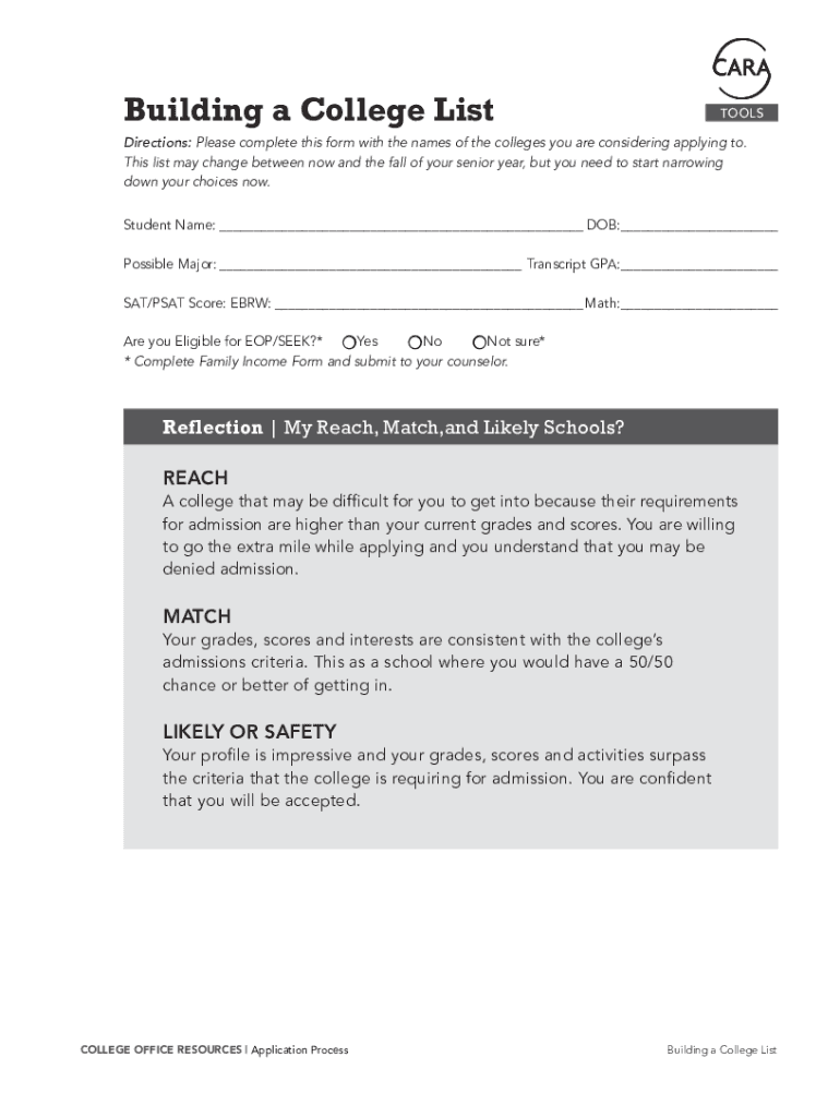 Building a College ListTOOLSDirections: Please complete this form with the names of the colleges you are considering applying to. This list may change between now and the fall of your senior year,