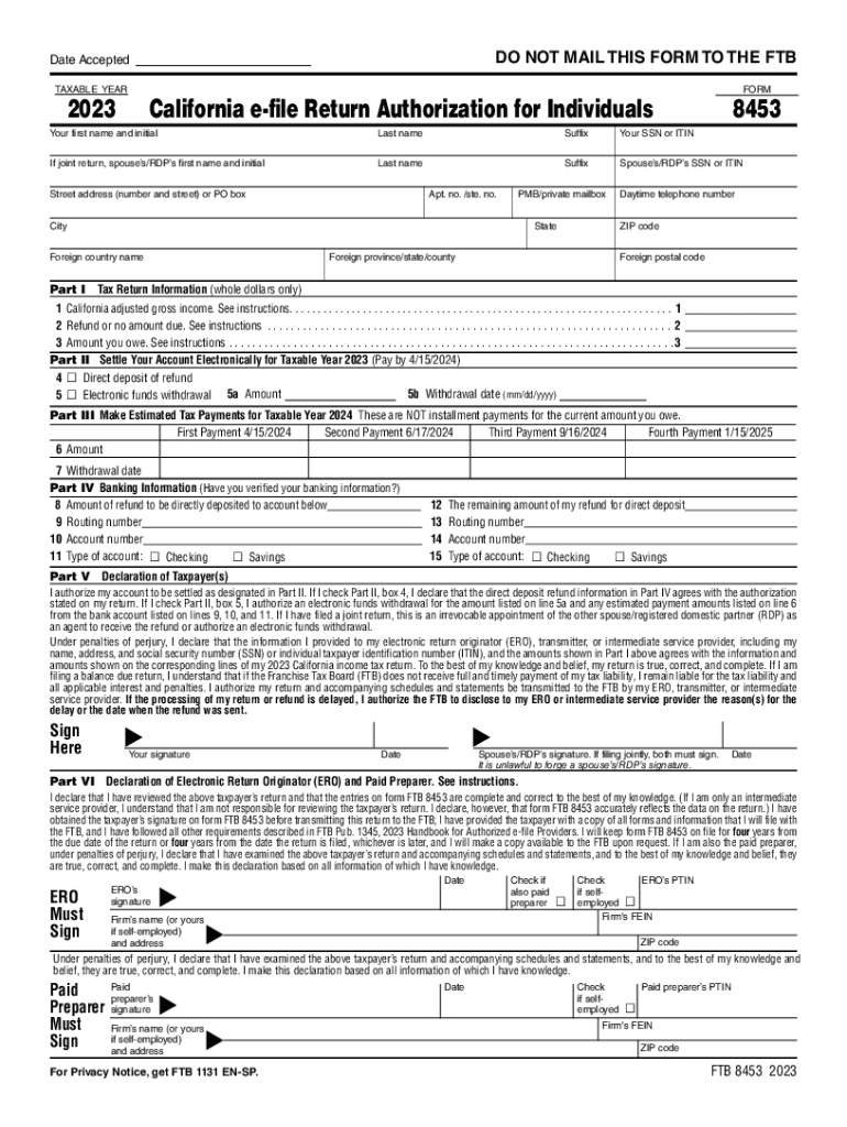 Individuals who file their California tax returns electronically and who must provide a signature to authenticate the submission are required to file Form 8453.