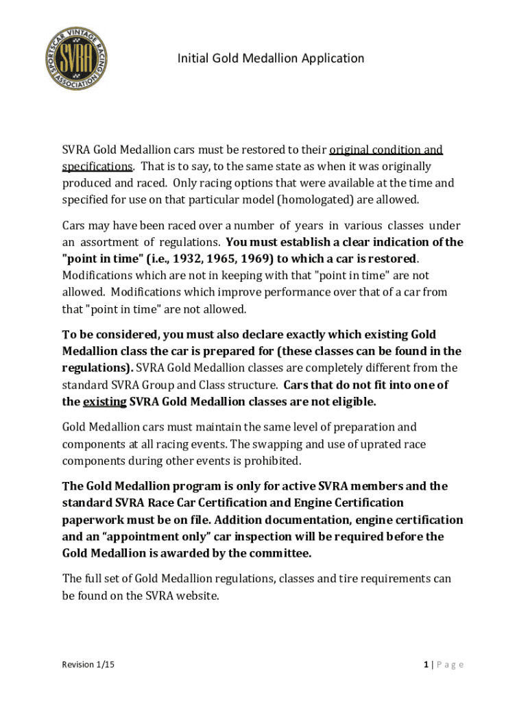 Initial Gold Medallion Applications Gold Medallion cars must be restored to their original condition and specifications. That is to say, to the same state as when it was originally produced and raced.