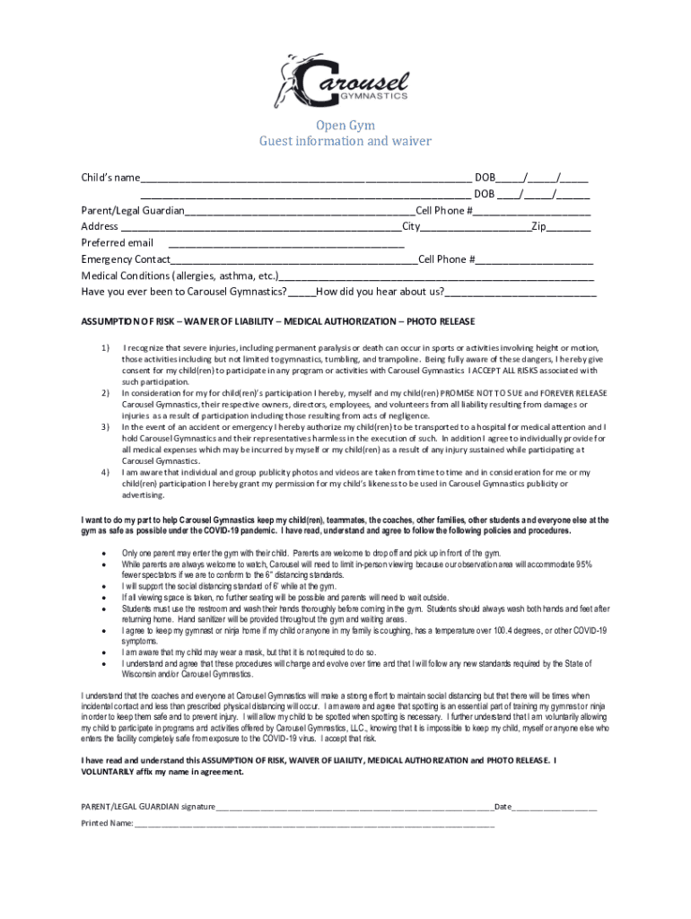 Open Gym Guest information and waiver Child's name___ DOB___/___/___ ___ DOB ___/___/___ Parent/Legal Guardian___Cell Phone #___ Address ___City___Zip___ Preferred email ___ Emergency Contact___Cell