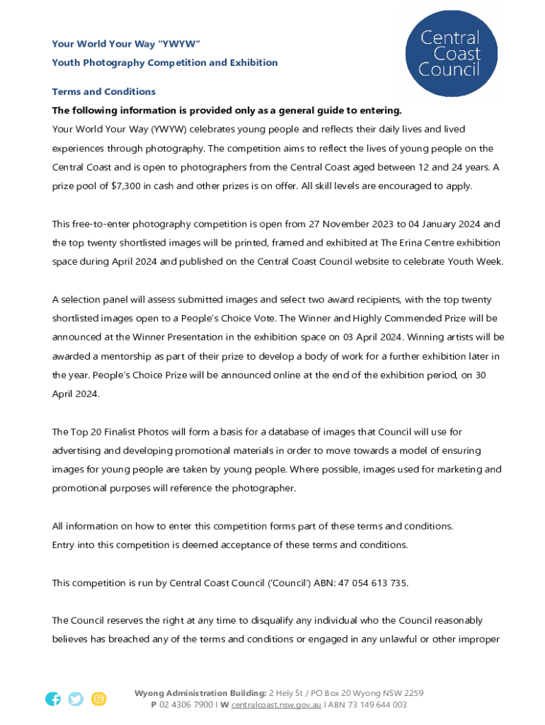 Your World Your Way YWYW Youth Photography Competition and Exhibition Terms and Conditions The following information is provided only as a general guide to entering. Your World Your Way (YWYW) celebrates