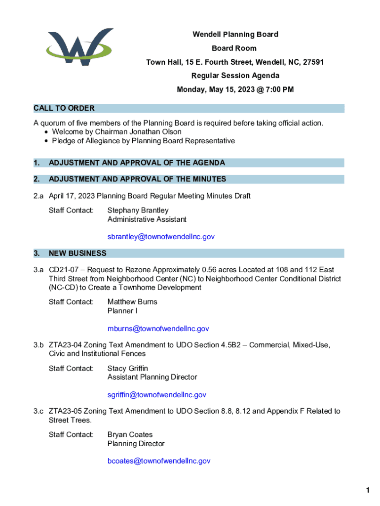 Wendell Planning Board Room Town Hall, 15 E. Fourth Street, Wendell, NC, 27591 Regular Session Agenda Monday, May 15, 2024 @ 7:00 PM CALL TO ORDER A quorum of five members of the Planning Board is