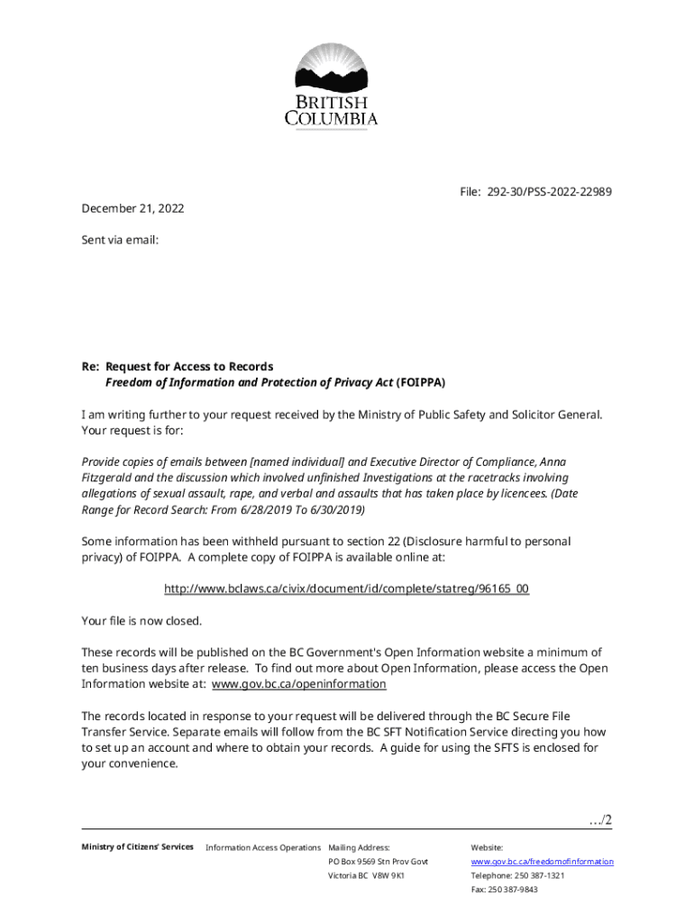 File: 29230/PSS202222989 December 21, 2022 Sent via email:Re: Request for Access to Records Freedom of Information and Protection of Privacy Act (FOIPPA) I am writing further to your request received
