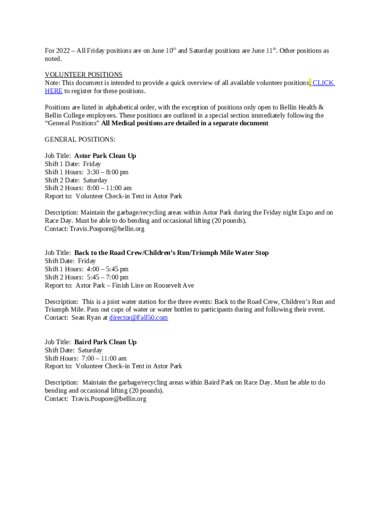 For 2022 All Friday positions are on June 10th and Saturday positions are June 11th. Other positions as noted. VOLUNTEER POSITIONS Note: This document is intended to provide a quick overview of all