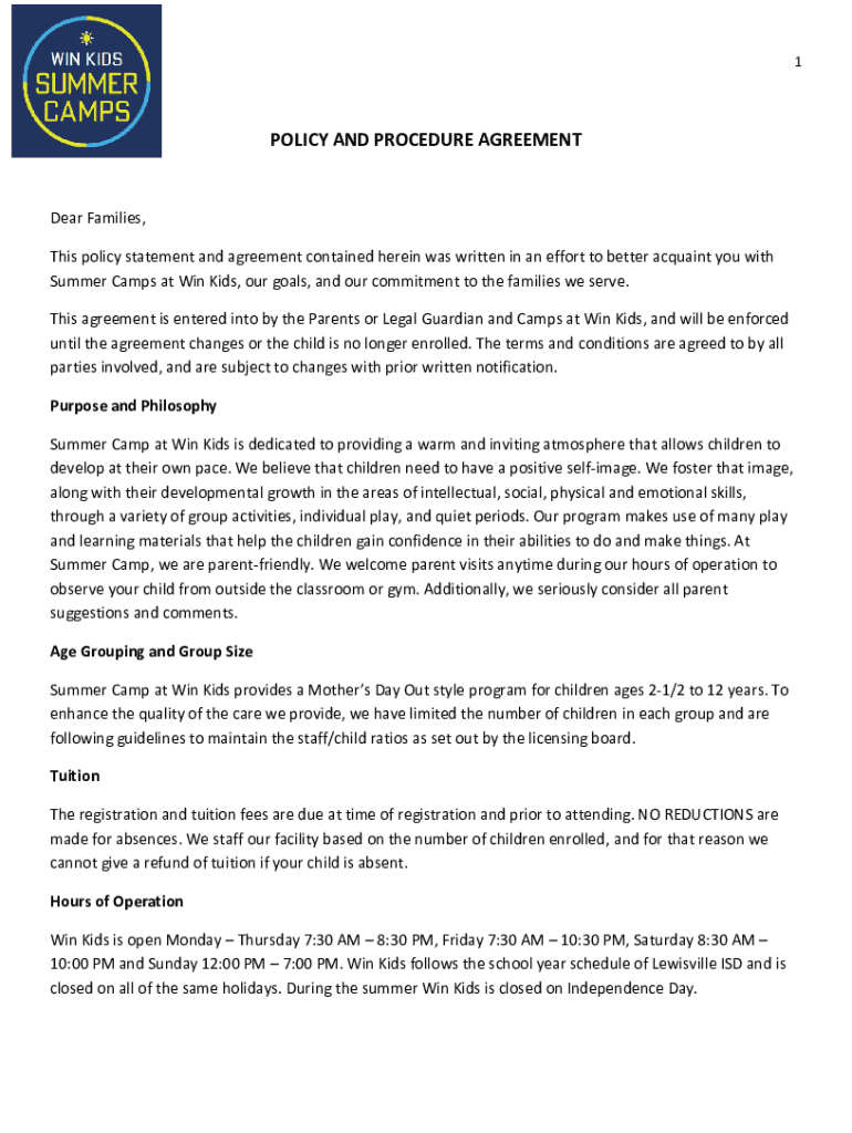 1POLICY AND PROCEDURE AGREEMENTDear Families,