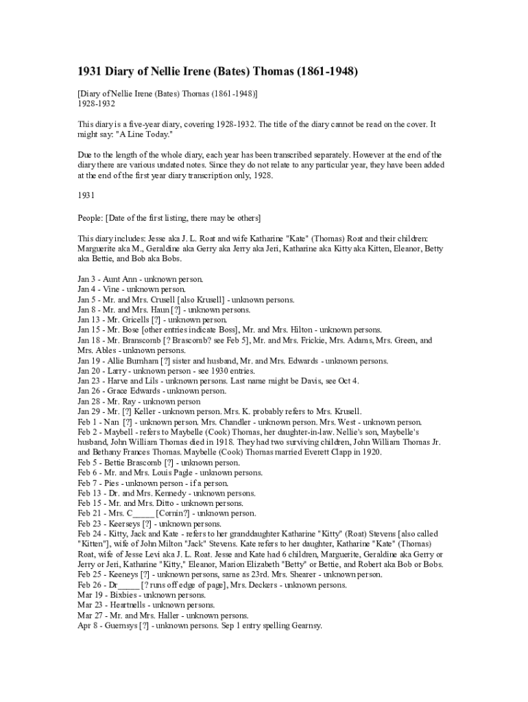 1931 Diary of Nellie Irene (Bates) Thomas (18611948) [Diary of Nellie Irene (Bates) Thomas (18611948)] 19281932 This diary is a five year diary, covering 19281932. The title of the diary cannot be