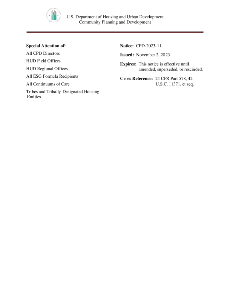 Community Planning and DevelopmentSpecial Attention of:Notice: CPD202311All CPD DirectorsIssued: November 2, 2023HUD Field Offices