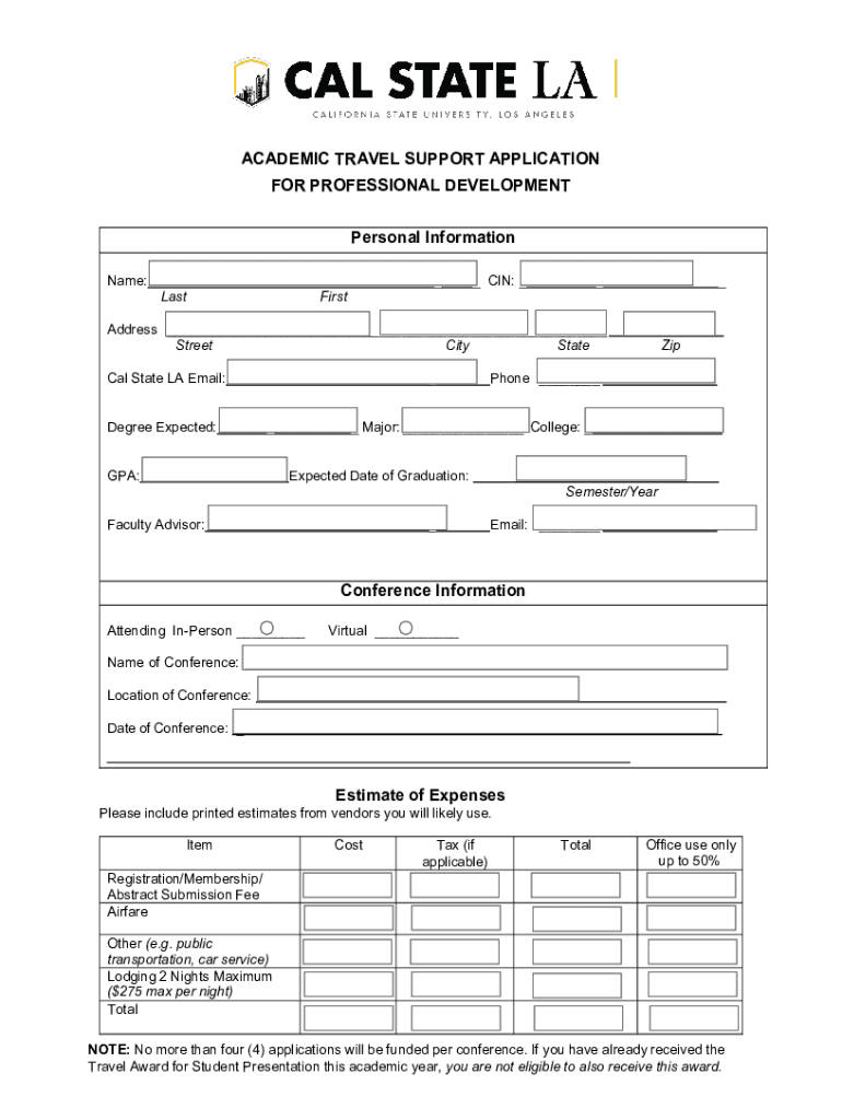 ACADEMIC TRAVEL SUPPORT APPLICATION FOR PROFESSIONAL DEVELOPMENT Personal Information Name:_ Last_ CIN: ___FirstAddress ___ Street City State Cal State LA Email: Degree Expected:_ _GPA:ZipPhone ____
