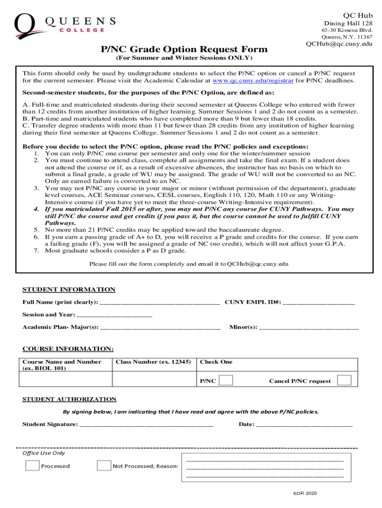 Queens, N.Y. 11367QCHub@qc.cuny.eduP/NC Grade Option Request Form