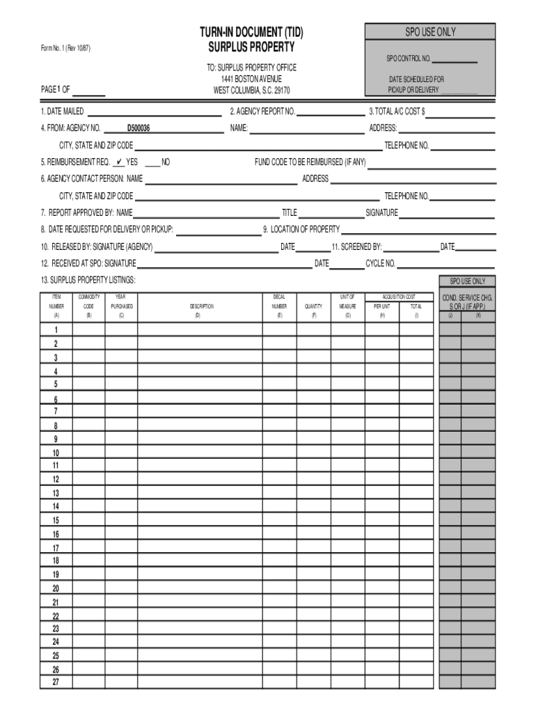 SURPLUS PROPERTYForm No. 1 (Rev 10/87)SO USE ONLY