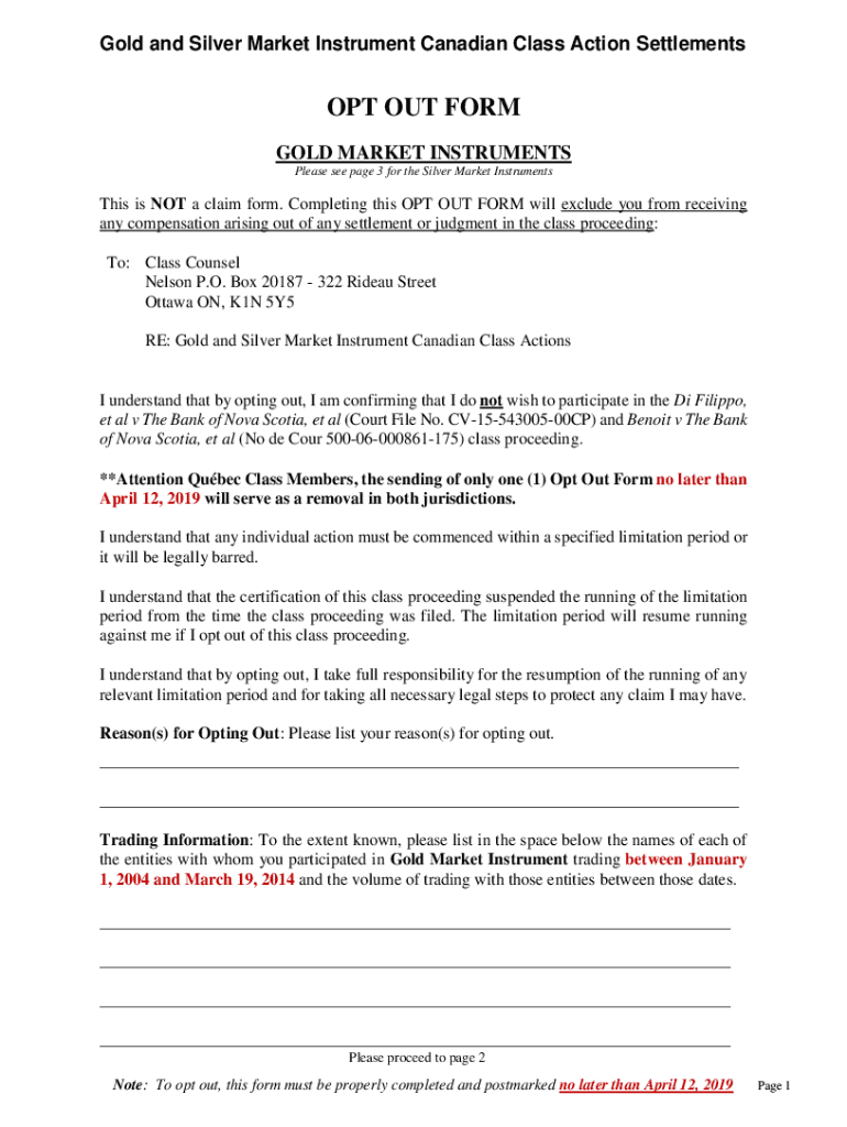 Gold and Silver Market Instrument Canadian Class Action Settlements OPT OUT FORM