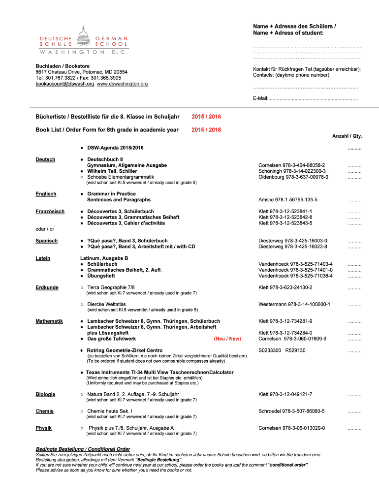 Name + Address DES Sch less / Name + Address of student: ................................................................. Buchanan / Bookstore 8617 Château Drive, Potomac, MD 20854 Tel. 301.767.3822