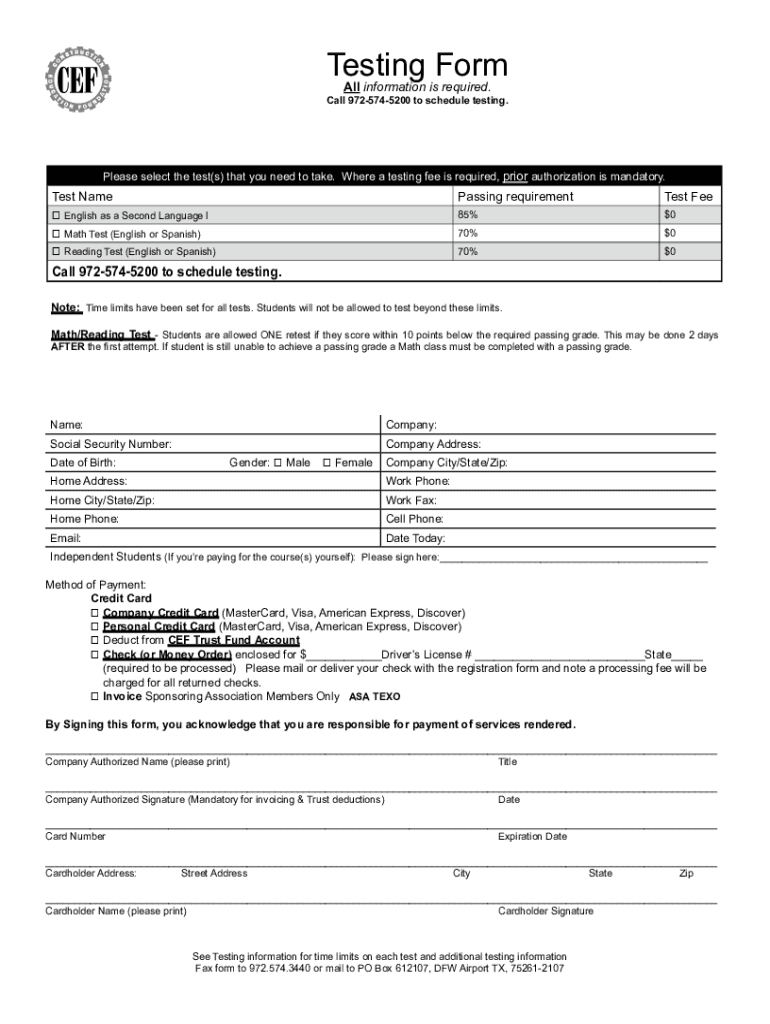 All information is required. Call 9725745200 to schedule testing. Please select the test(s) that you need to take. Where a testing fee is required, prior authorization is mandatory. Test