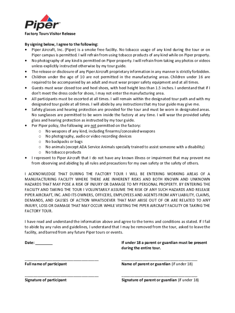 Piper Aircraft, Inc. (Piper) is a smoke-free facility. No tobacco usage of any kind during the tour or on