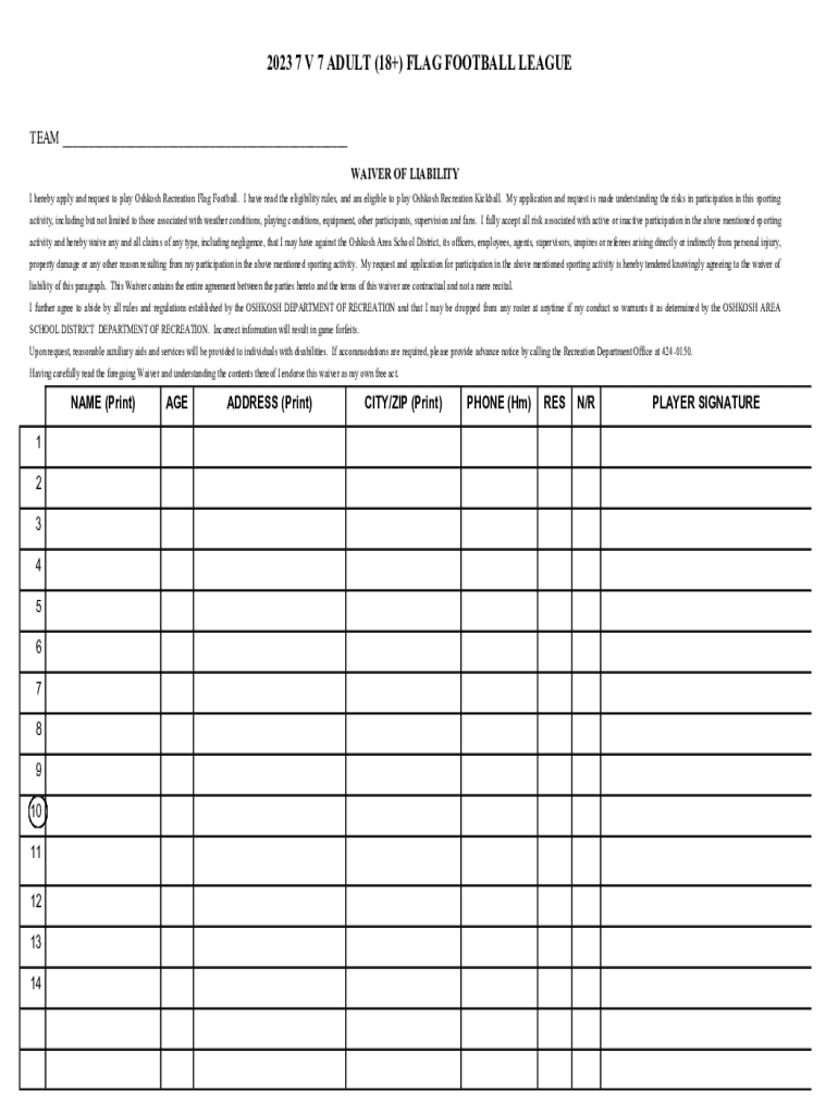 2023 7 V 7 ADULT (18+) FLAG FOOTBALL LEAGUE TEAM ___ WAIVER OF LIABILITY I hereby apply and request to play Oshkosh Recreation Flag Football. I have read the eligibility rules, and am eligible to