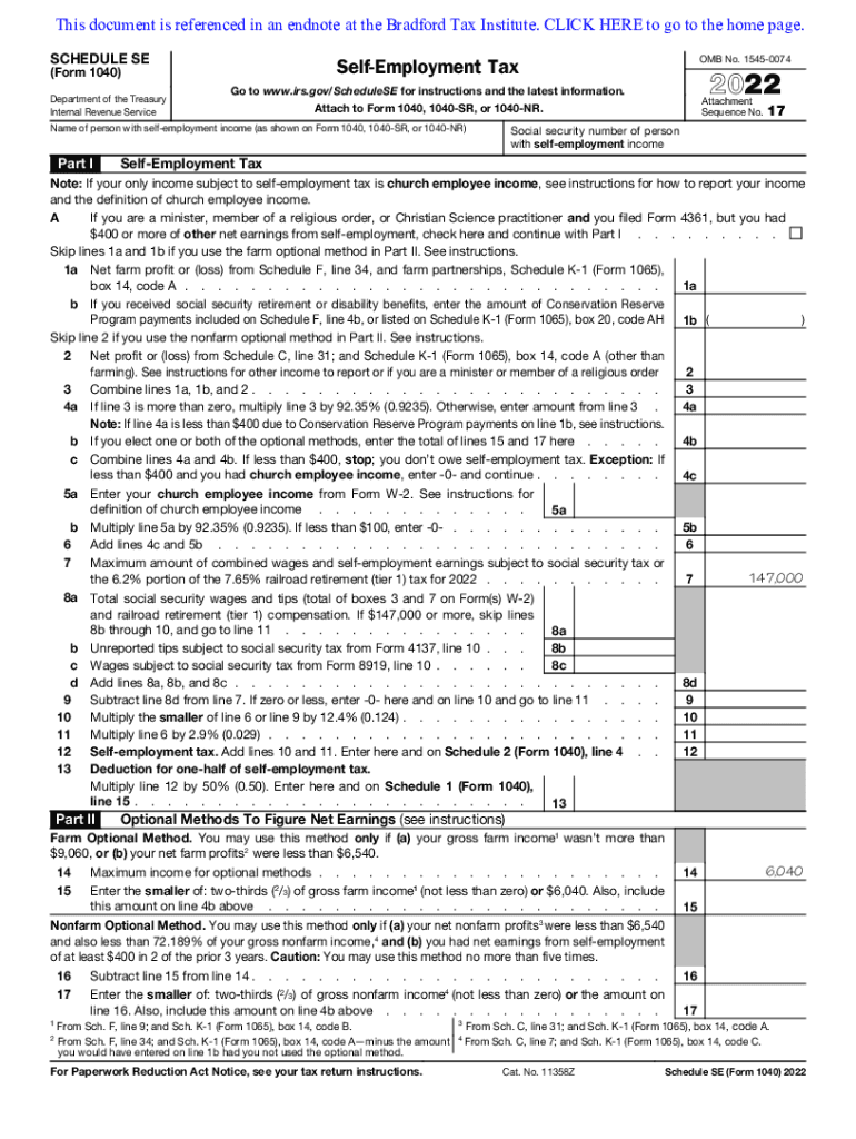This document is referenced in an end note at the Bradford Tax Institute. CLICK HERE to go to the home page. SCHEDULE SE Department of the Treasury Internal Revenue Service2022Go to www.irs.gov/ScheduleSE