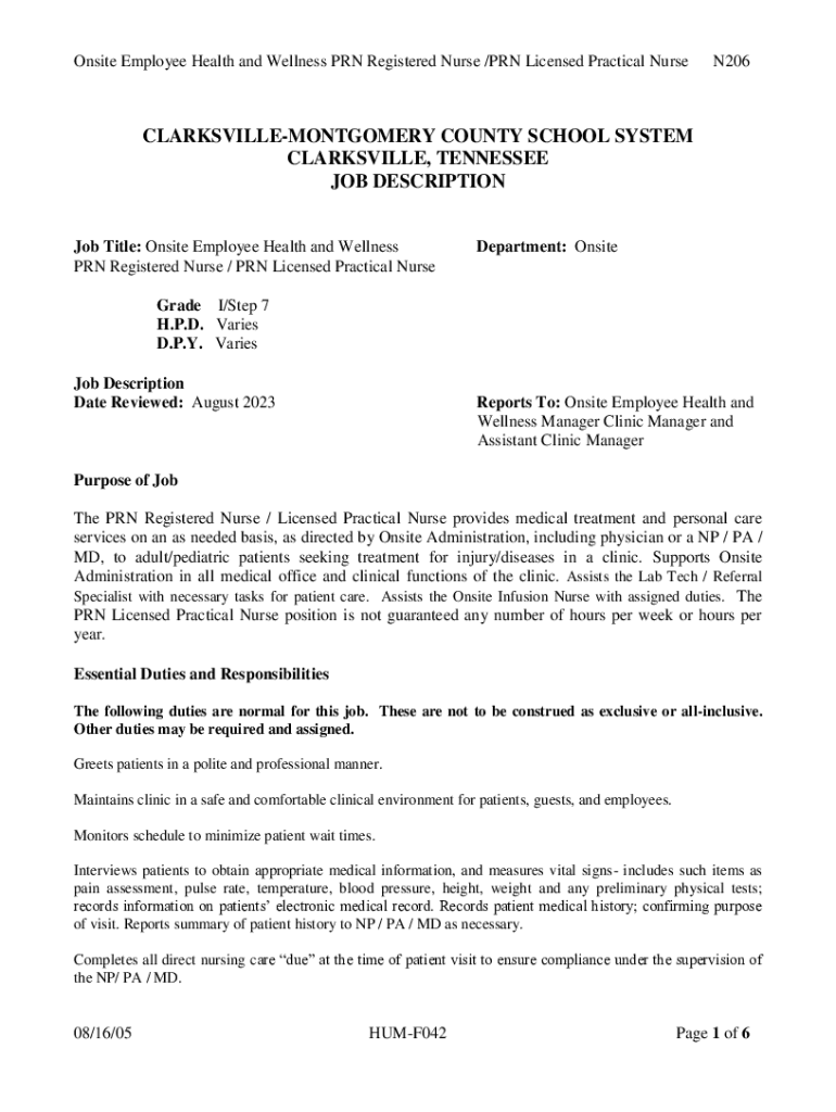 Onsite Employee Health and Wellness PRN Registered Nurse /PRN Licensed Practical NurseN206CLARKSVILLEMONTGOMERY COUNTY SCHOOL SYSTEM CLARKSVILLE, TENNESSEE JOB DESCRIPTION Job Title: Onsite Employee