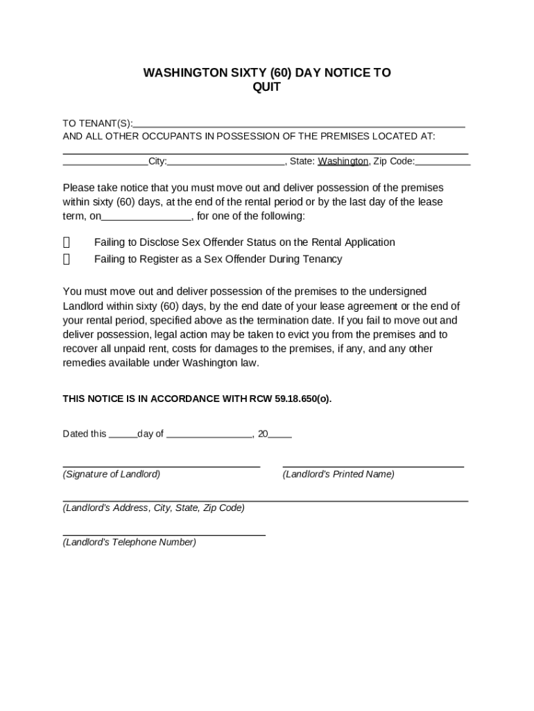 Washington Sixty (60) Day Notice to Quit (Sex Offender) word template: frequently asked questions