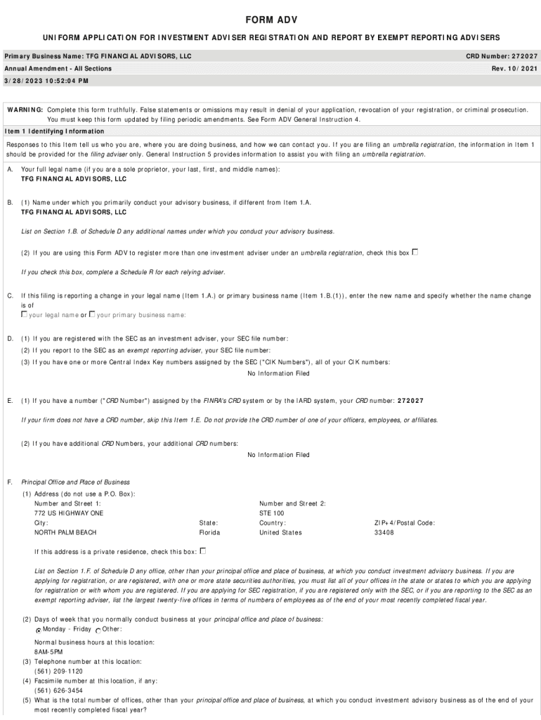 FORM ADV UNIFORM APPLICATION FOR INVESTMENT ADVISER REGISTRATION AND REPORT BY EXEMPT REPORTING ADVISERS Primary Business Name: TFG FINANCIAL ADVISORS, LLCCRD Number: 272027Annual Amendment All SectionsRev.