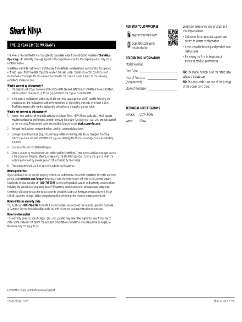 registeryourshark.combine (5) YEAR LIMITED WARRANTY
