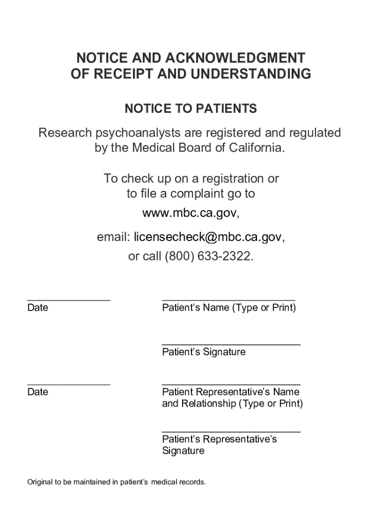 NOTICE AND ACKNOWLEDGMENT OF RECEIPT AND UNDERSTANDING NOTICE TO PATIENTS Research psychoanalysts are registered and regulated by the Medical Board of California. To check up on a registration or