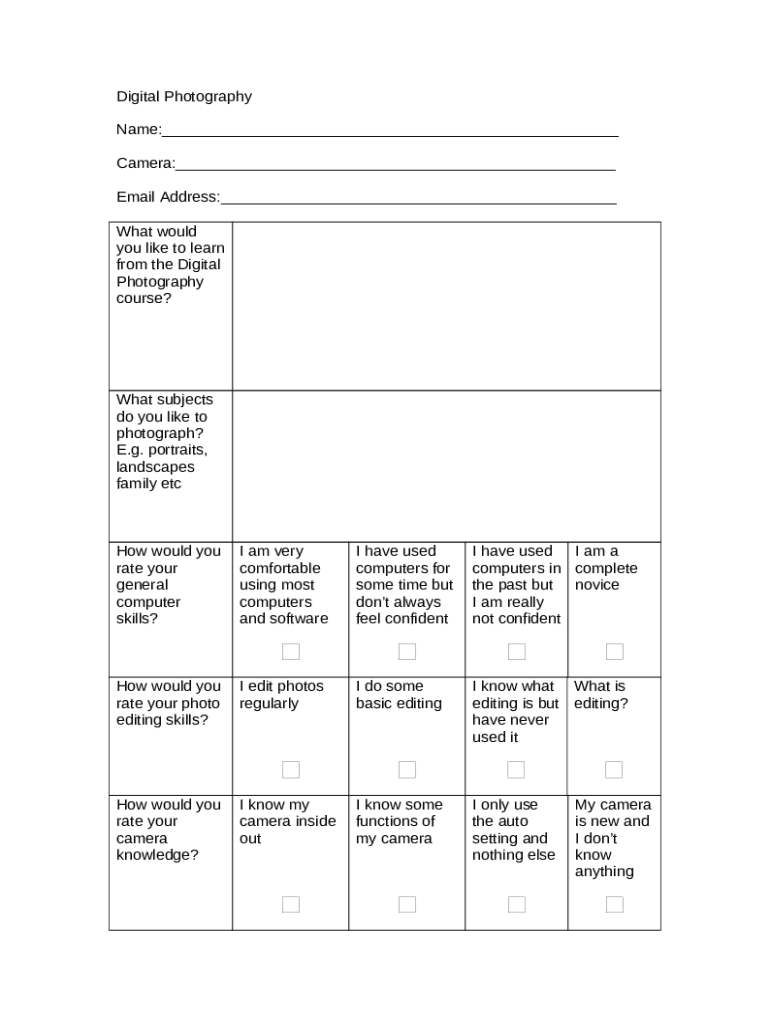 The What's your favorite subject to capture through digital ... is a writable document that can be filled-out and signed for specific needs. In that case, it is furnished to the relevant addressee in order to provide some details of any kinds. The completion and signing is available in hard copy or with an appropriate service e. g. PDFfiller. Such tools help to fill out any PDF or Word file online. It also lets you edit its appearance for your requirements and put legit e-signature. Once finished, you send the What's your favorite subject to capture through digital ... to the recipient or several ones by email and also fax. PDFfiller is known for a feature and options that make your Word template printable. It includes different options for printing out appearance. It does no matter how you will send a form after filling it out - physically or electronically - it will always look neat and organized. To not to create a new writable document from the beginning again and again, make the original form as a template. After that, you will have an editable sample.