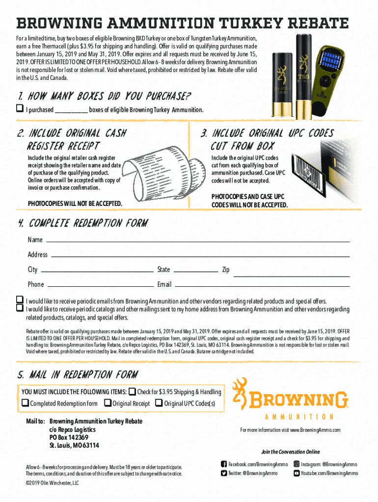 BROWNING AMMUNITION TURKEY Rebate a limited time, buy two boxes of eligible Browning BXD Turkey or one box of Tungsten Turkey Ammunition,