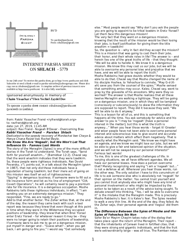 The Parashat ShelachTexts & Source Sheets from Torah ... is a writable document which can be filled-out and signed for certain reasons. Next, it is furnished to the exact addressee in order to provide certain information and data. The completion and signing may be done manually or using an appropriate solution like PDFfiller. These applications help to complete any PDF or Word file without printing them out. It also allows you to edit its appearance depending on your needs and put a legal electronic signature. Once you're good, you send the Parashat ShelachTexts & Source Sheets from Torah ... to the respective recipient or several recipients by mail and also fax. PDFfiller includes a feature and options that make your blank printable. It offers a number of options for printing out appearance. No matter, how you distribute a document - in hard copy or electronically - it will always look professional and organized. To not to create a new document from the beginning again and again, turn the original form into a template. After that, you will have a rewritable sample.