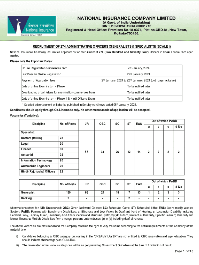 NATIONAL INSURANCE COMPANY LIMITED (A Govt. of India Undertaking) IN: U10200WB1906GOI001713 Registered & Head Office: Premises No.180374, Plot no.CBD81, New Town, Kolkata700156.RECRUITMENT OF 274