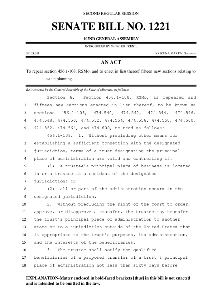 SECOND REGULAR SESSIONSENATE BILL NO. 1221 102ND GENERAL ASSEMBLY INTRODUCED BY SENATOR TRENT. 3910S.01IKRISTINA MARTIN, Secretary AN ACT To repeal section 456.1108, RSM, and to enact in lieu thereof