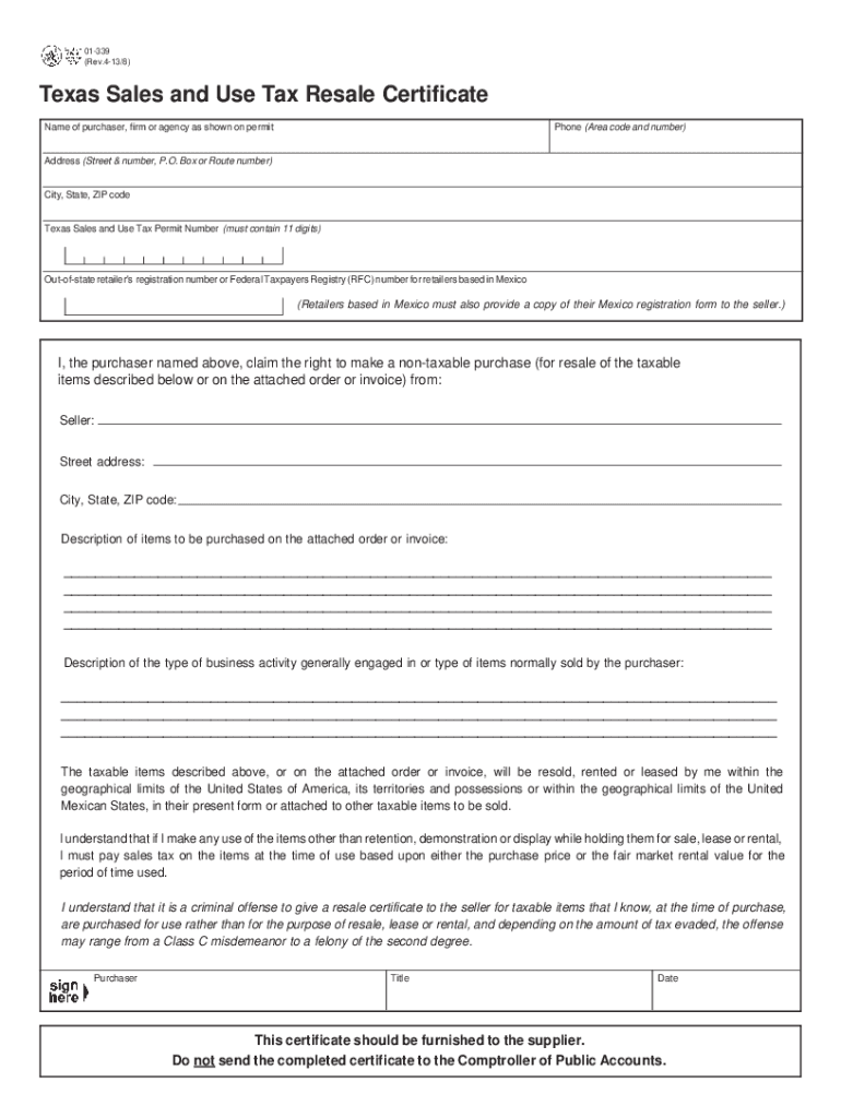 (Rev.413/8)CLEAR SIDE Texas Sales and Use Tax Resale Certificate