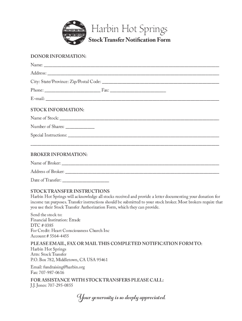 Harbin Hot SpringsStock Transfer Notification Form DONOR INFORMATION: Name: ___ Address: ___ City: State/Province: Zip/Postal Code: ___ Phone: ___ Fax: ___ Email: ___ STOCK INFORMATION: Name of Stock: