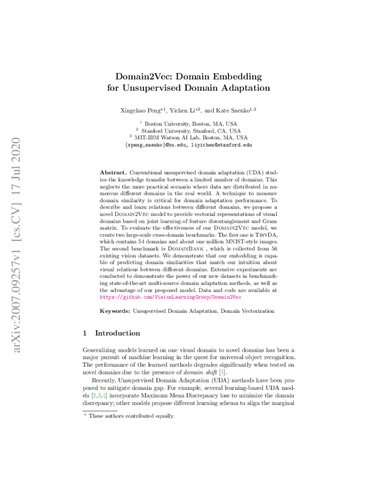 Domain2Vec: Domain Embedding for Unsupervised Domain Adaptation Xingchao Peng1 , Yichen Li2 , and Kate Saenko1,3 1Boston University, Boston, MA, USA Stanford University, Stanford, CA, USA 3 MITIBM