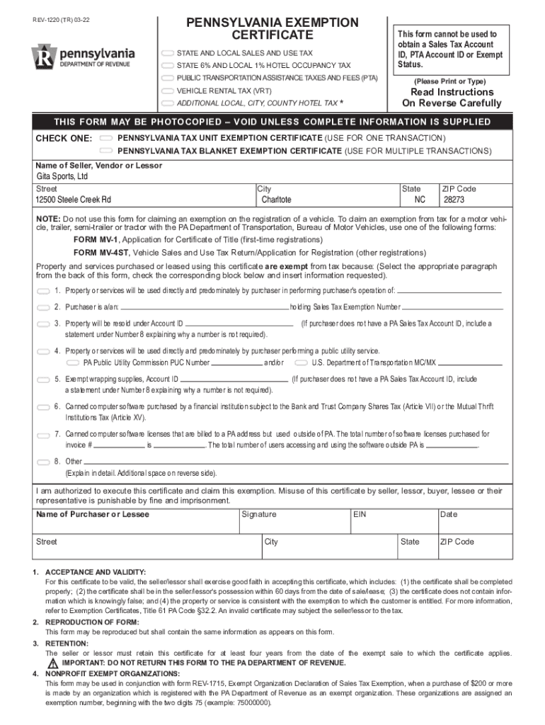 REV1220 (TR) 0322STARTPENNSYLVANIA EXEMPTION