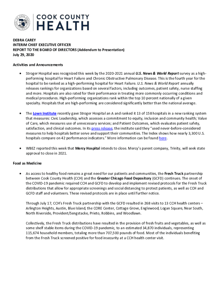 DEBRA CAREY INTERIM CHIEF EXECUTIVE OFFICER REPORT TO THE BOARD OF DIRECTORS (Addendum to Presentation) July 29, 2020 Activities and Announcements Stroger Hospital was recognized this week by the