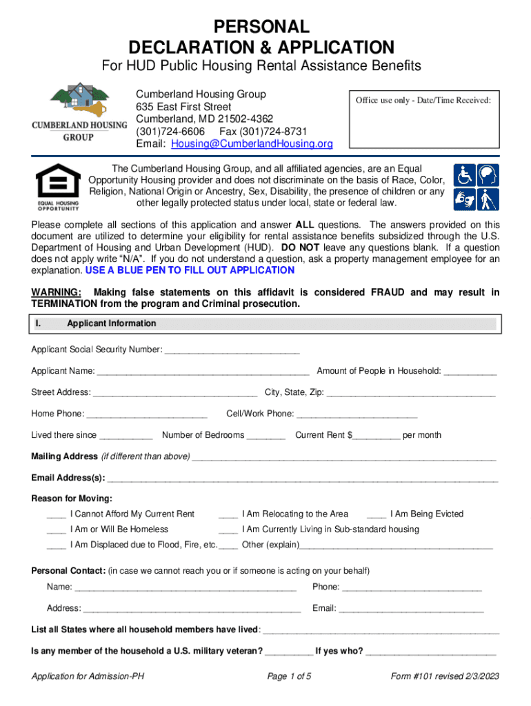 PERSONAL DECLARATION & APPLICATION For HUD Public Housing Rental Assistance Benefits Cumberland Housing Group 635 East First Street Cumberland, MD 215024362 (301)7246606 Fax (301)7248731 Email: Housing@CumberlandHousing.orgOffice