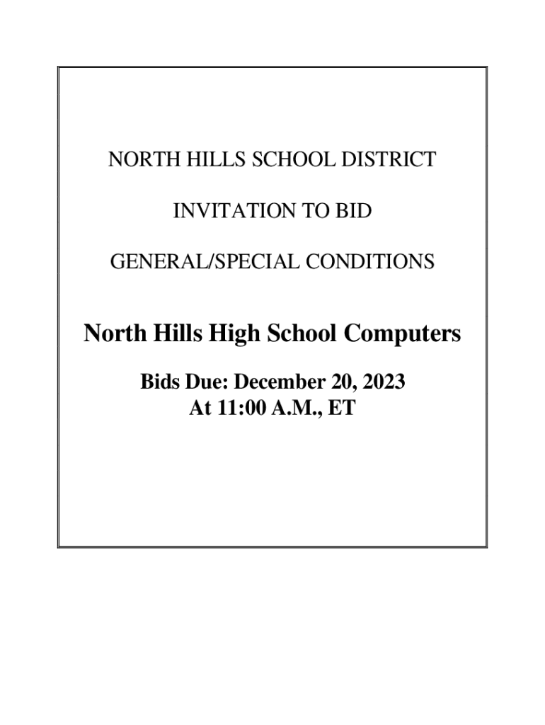 NORTH HILLS SCHOOL DISTRICT INVITATION TO BID GENERAL/SPECIAL CONDITIONSNorth Hills High School Computers Bids Due: December 20, 2023 At 11:00 A.M., ETNORTH HILLS SCHOOL DISTRICT 135 SIXTH AVENUE