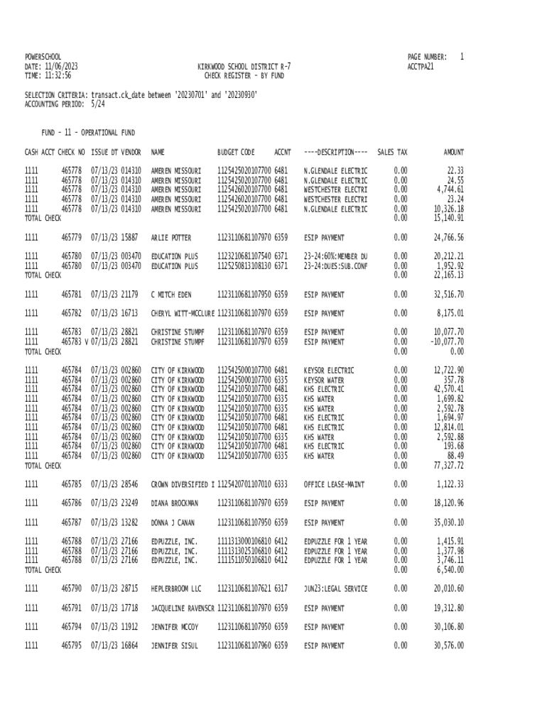 CHECK REGISTER BY FUND1SELECTION CRITERIA: transact.ck_date between \'20230701\' and \'20230930\'