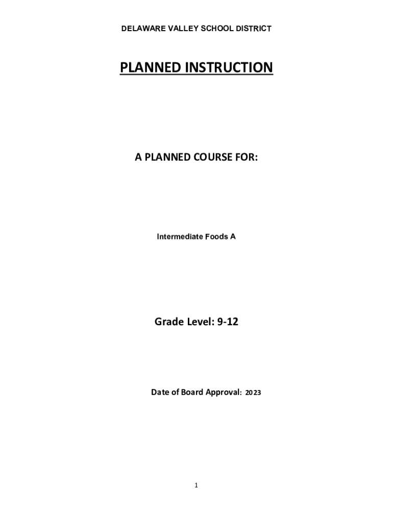 DELAWARE VALLEY SCHOOL DISTRICTPLANNED INSTRUCTION PLANNED COURSE FOR:Intermediate Foods Grade Level: 912Date of Board Approval: 20231DELAWARE VALLEY SCHOOL DISTRICTPlanned Instruction