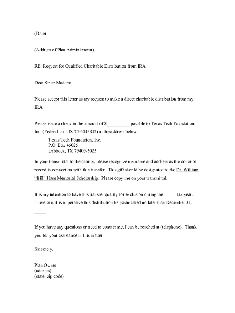 (Date) (Address of Plan Administrator) RE: Request for Qualified Charitable Distribution from IRA Dear Sir or Madam: Please accept this letter as my request to make a direct charitable distribution