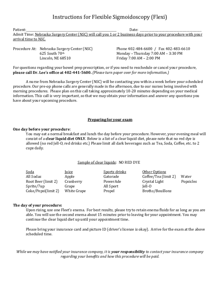 Instructions for Flexible Sigmoidoscopy (Flex) Patient:___ Date: ___ Admit Time: Nebraska Surgery Center (NSC) will call you 1 or 2 business days prior to your procedure with your arrival time to